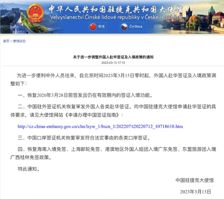 最早官宣此消息的是中國駐捷克大使館的官網。
