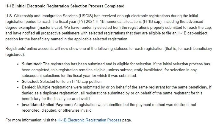 截止到目前為止,移民局雖然還未官宣今年一共收到多少份電子注冊、中簽情況如何,但移民局宣布:他們今年收到的H-1B注冊數量已達到抽簽類H-1B的年度上限,他們已經完成了抽簽且已經更新完了所有中簽情況!