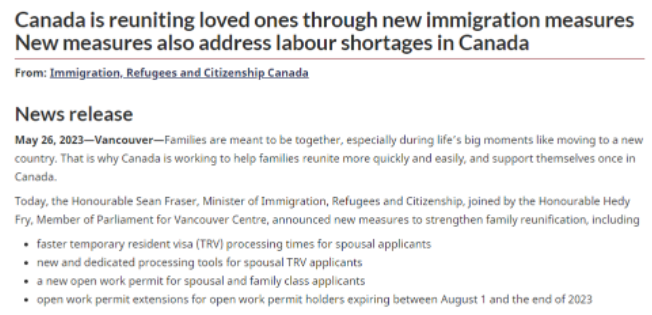 弗雷澤表示,使用先進的分析和技術在30天內處理永久居民和公民的家庭成員的TRV (臨時居民簽證)申請的新方法。這些家庭成員可以在等待永久居留申請決定的同時訪問加拿大與家人見面。